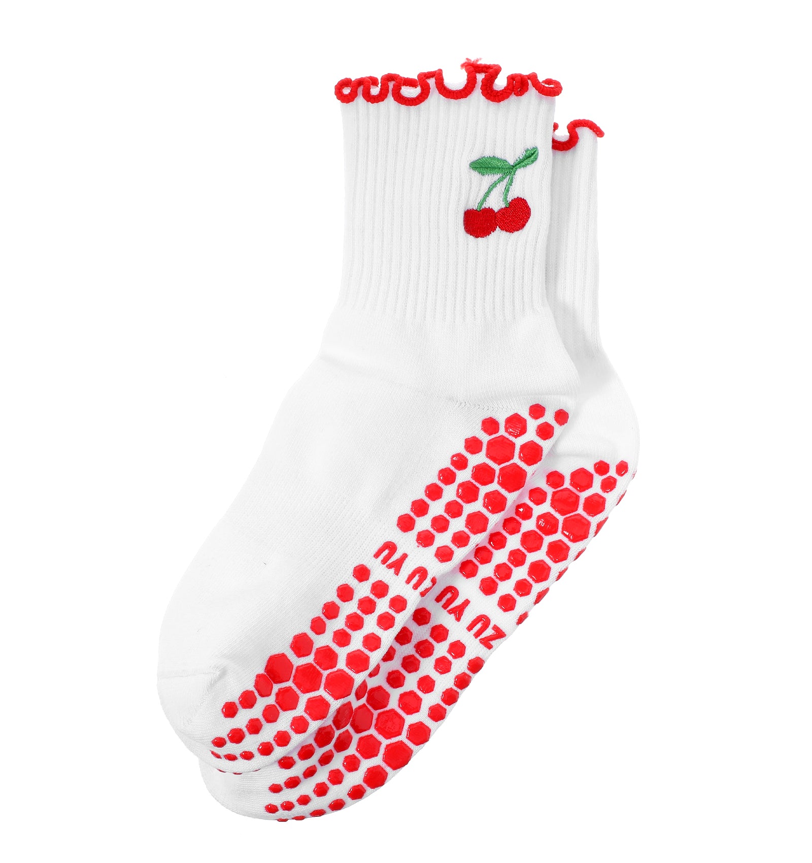 Cherry Pilates Socks, 1Pair Non-slip Grippy Yoga Socks for Women with Ruffle and Lace Design for Barre Workout