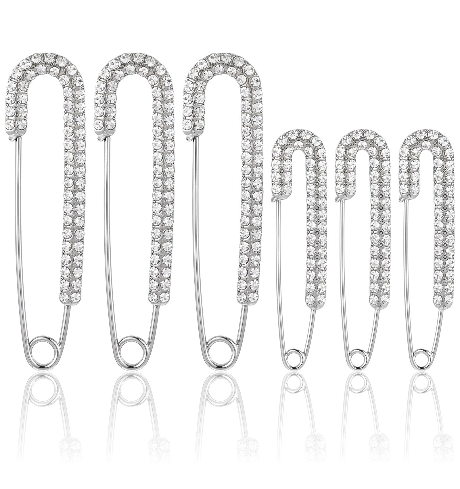 Decorative Safety Pins 6-Pack - Rhinestone Brooch Clips for Sweaters/Dresses/Scarves, Faux Crystal Fashion Accessories for Women (Silver Sparkle Non-Slip Clips)