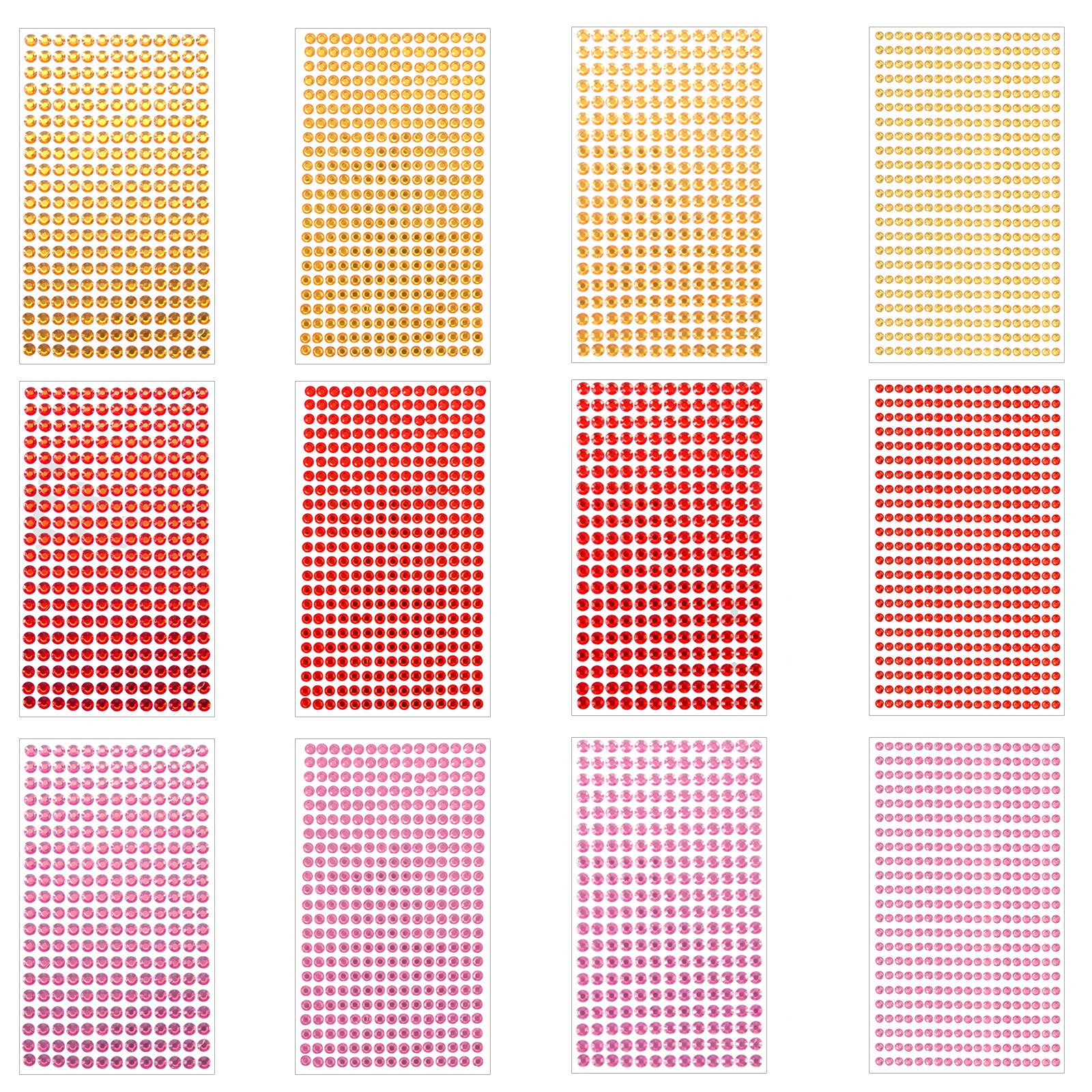 Packing List: 5376pcs Sticker Gems (Golden Yellow + Bright Red + Light Pink (6mm - 260 pieces + 5mm - 345 pieces + 4mm - 437 pieces + 3mm - 750 pieces)