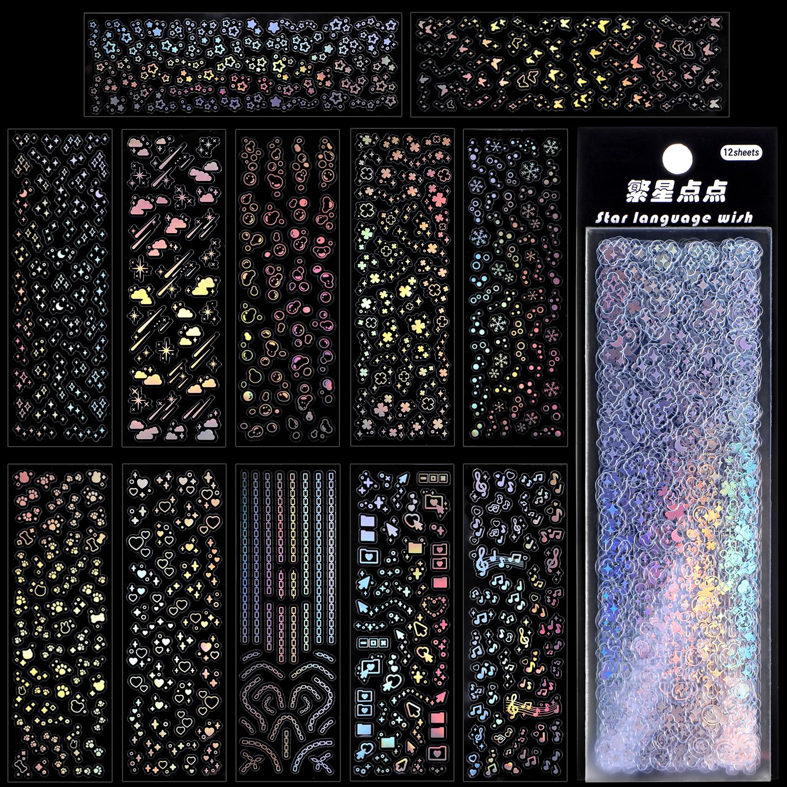 Oruola 24 Sheets Holographic Kpop Deco Stickers for Photocards,Self Adhesive Laser Korean Stickers Holographic Clear Glitter Stickers Mini Stickers Chain Butterfly Star Bubbles Decals Bling Sticker