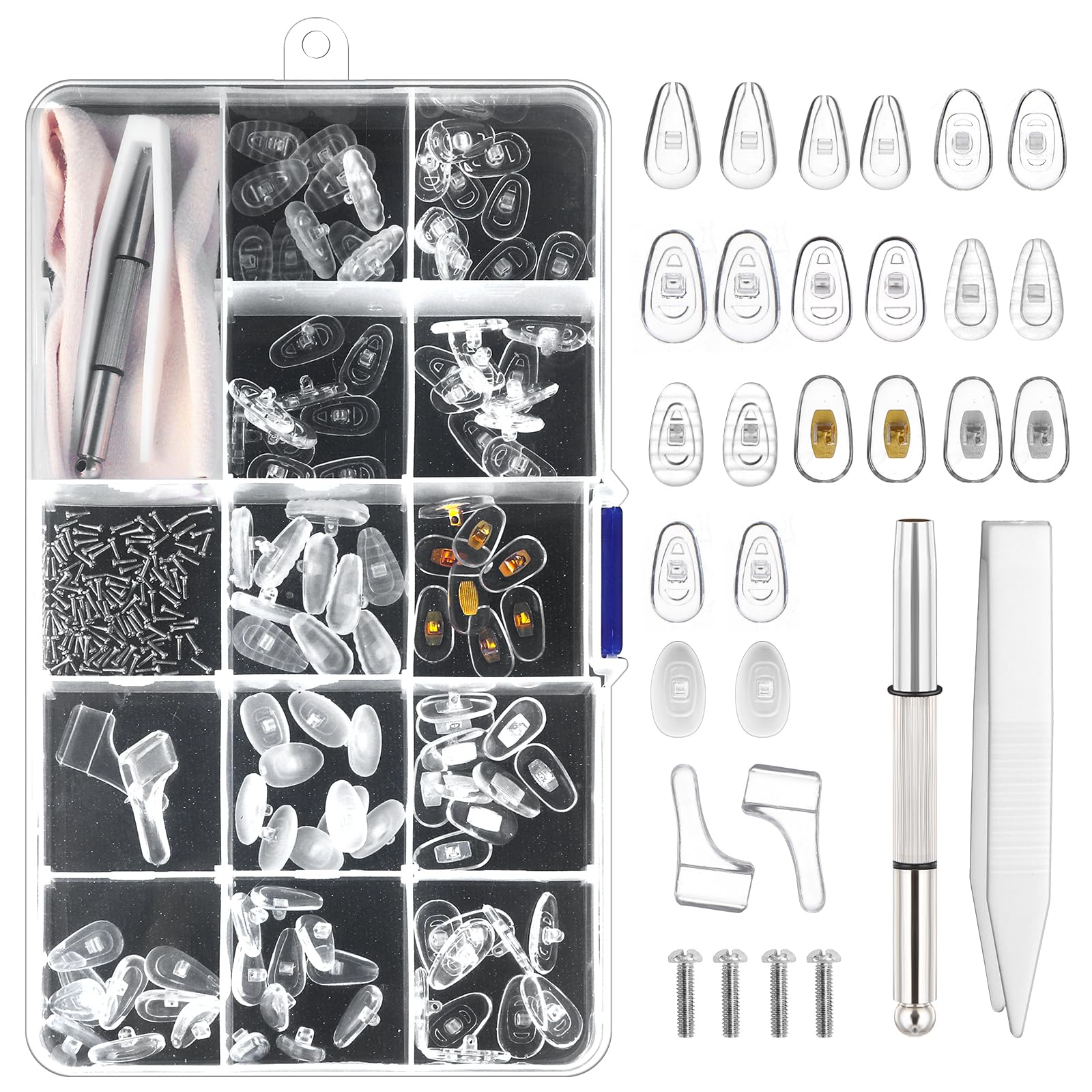 Packing list: 55 pairs of nose pads (11 styles, 5 pairs each) + screws x 110 + 3-in-1 micro screwdriver x 1 + tweezers x 1 + glasses holder x 1 pair + glasses cloth x 1 + transparent tool box x 1
