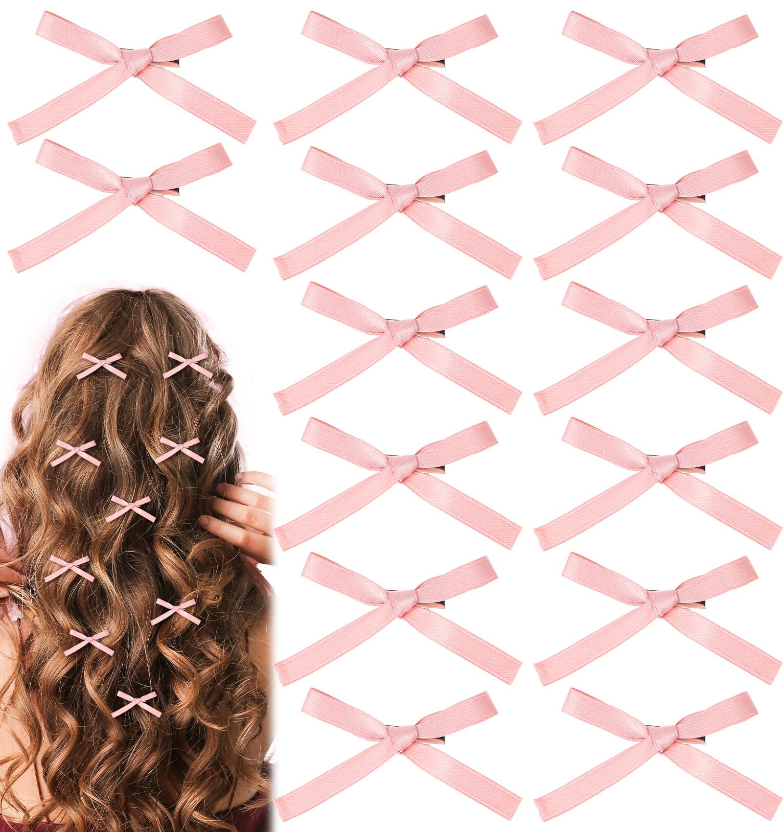 Pink Hair Bow, 12 Pcs Satin Pink Bows for Hair Clips, Cute Accessories for Girls and Women, Wedding, Parties, Birthday, Valentine's Day Gift