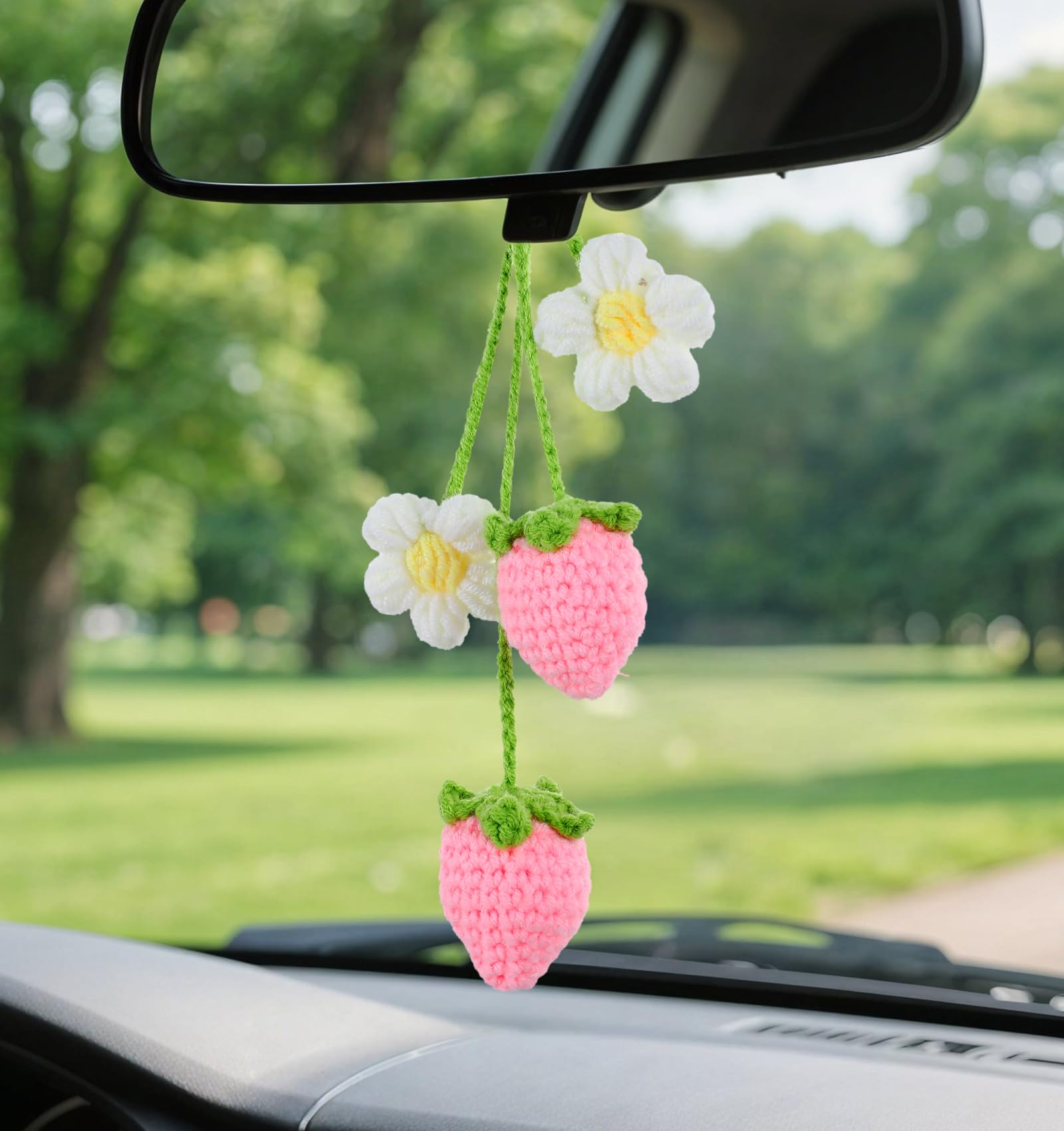 Strawberry Car Decor 2-Pack - Crochet Handmade with Polyester Fiber Cute Aesthetic Hanging Ornaments for Cars Women Girls Rearview Mirror Accessories